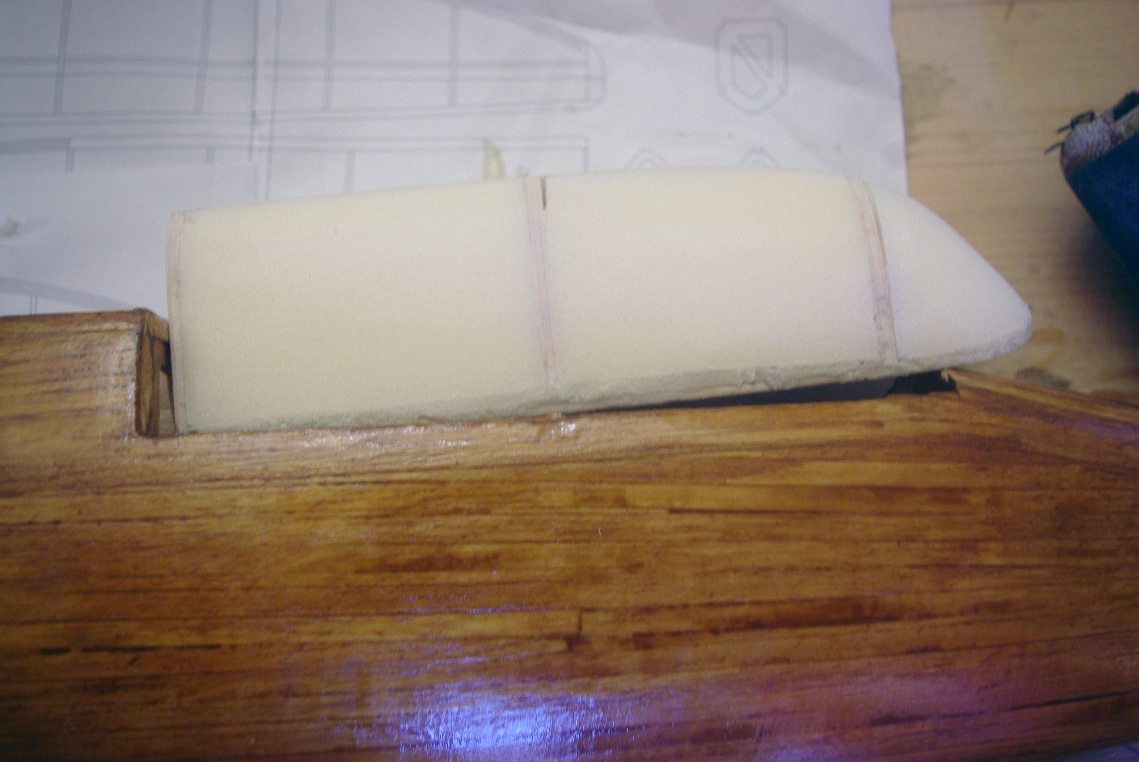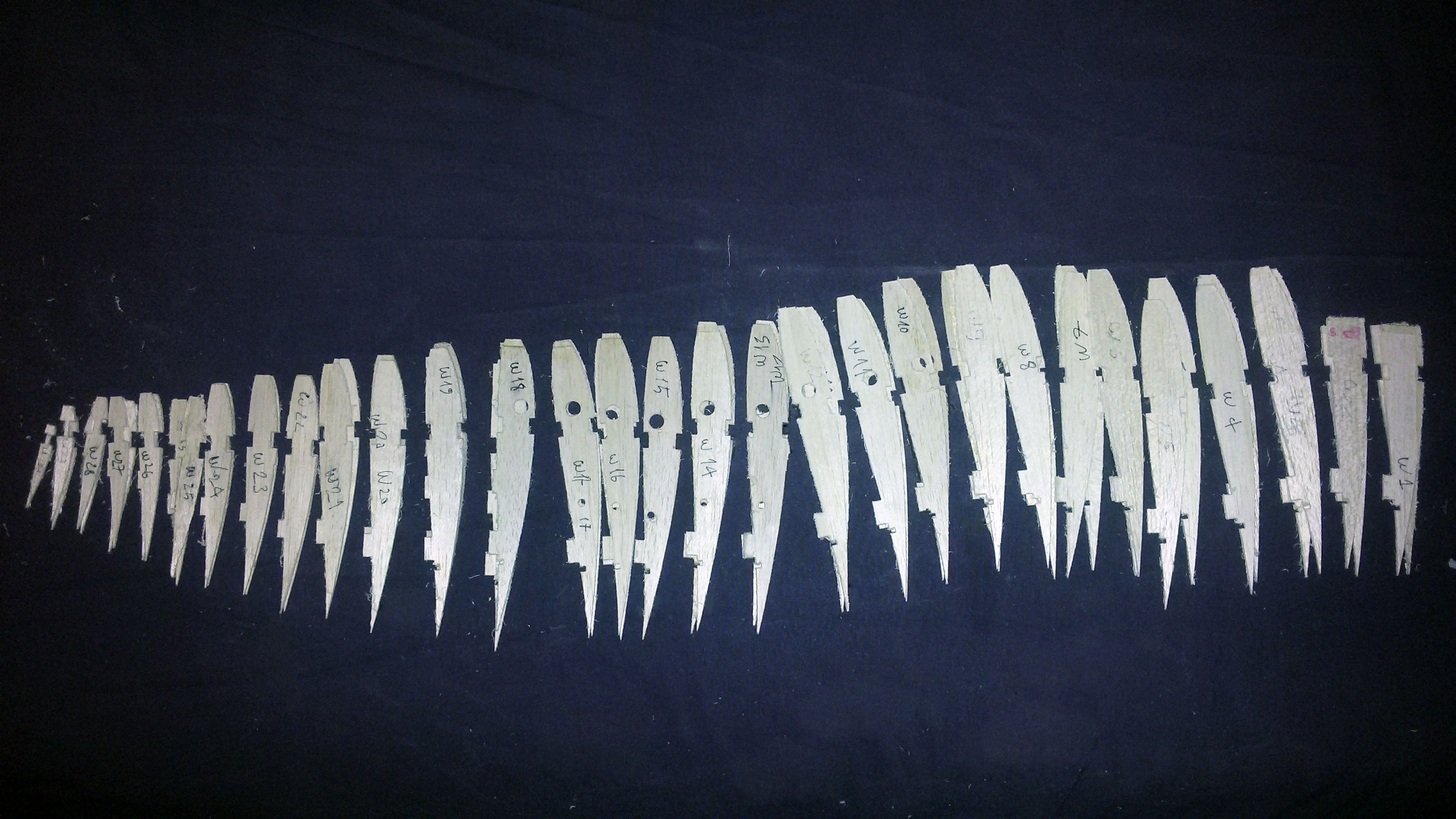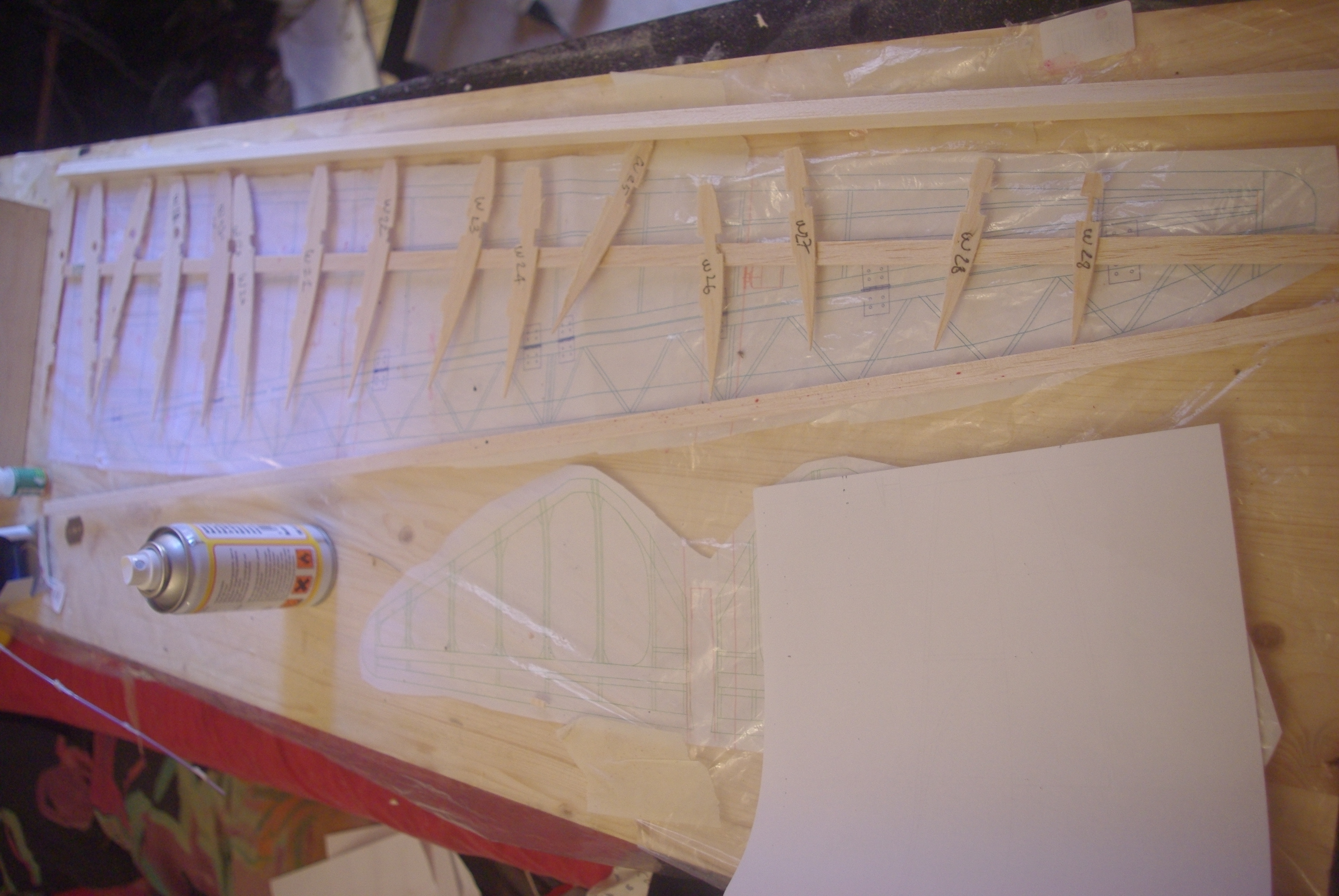 ed ancora si nota che le centine hanno dei piesini di appoggio per il piano perche essendo un profilo concavo convesso nopn poggerebbe bene sul piano ed in piu è prevista una svergolatura ala re di estremita che anticipa lo stallo :aiuta l'aereo a non stallare ( è una pratica nota che si fa sugli alianti :praticamente le estremita alari hanno un angolo di incidenza inferiore alla radice