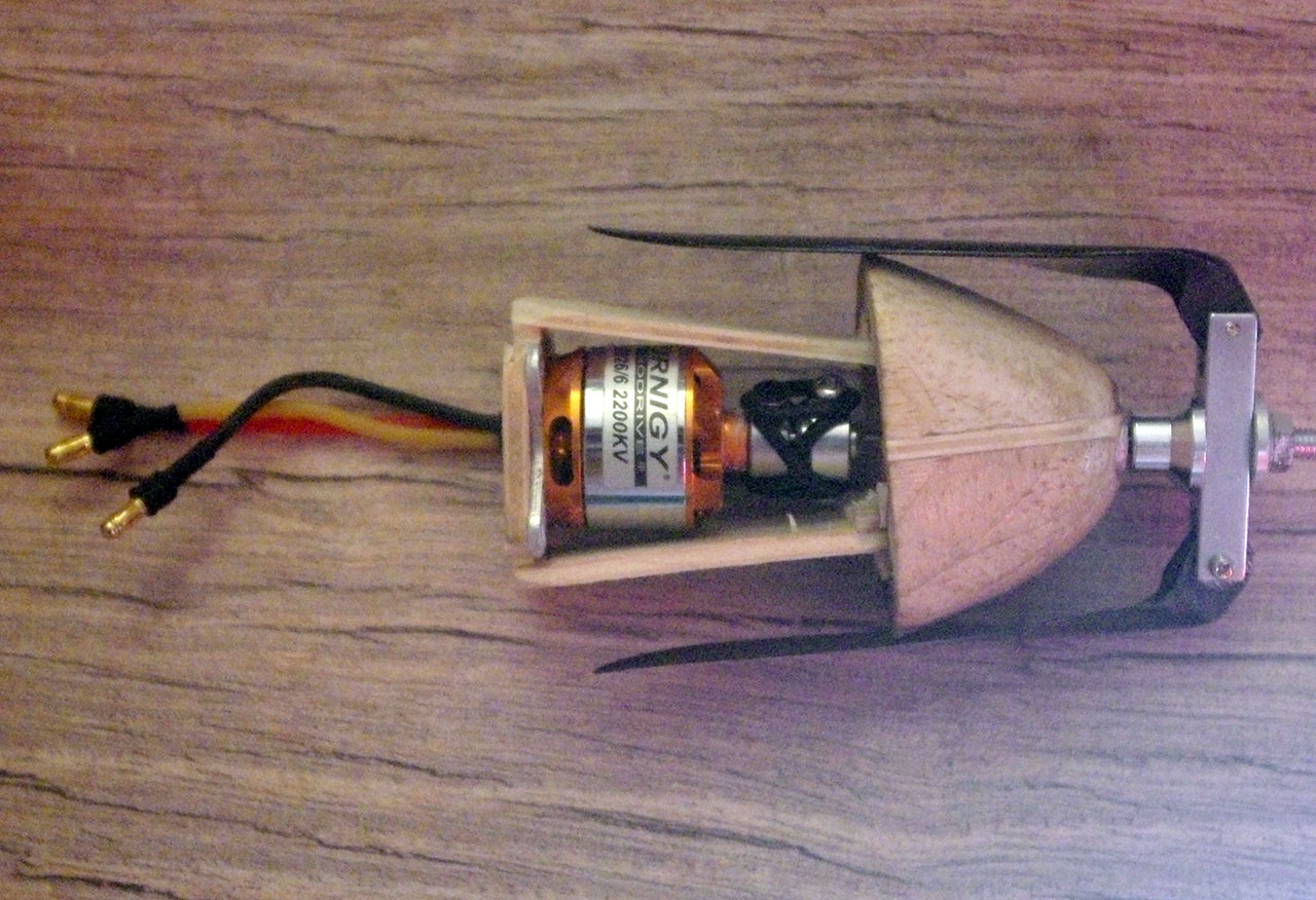 praticamente all'interno del nasetto del modello c'è il centrale portacuscinetti di un vecchio motore eletrico solo il centrale senza cassa ed avvolgimenti che viene collegato all'albero del motore tramite due salvaelica con oring